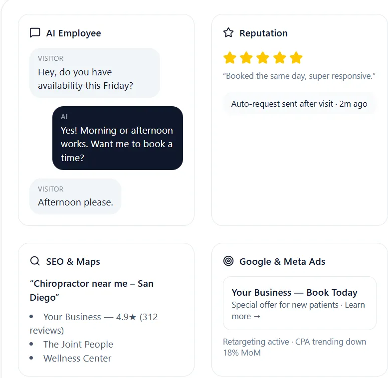 24/7 follow-up, appointment booking, FAQs, and missed-call text-back so you never lose a lead.